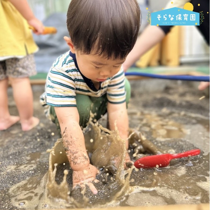 砂場の土にお水が加わると“どろんこ”のはじまり。