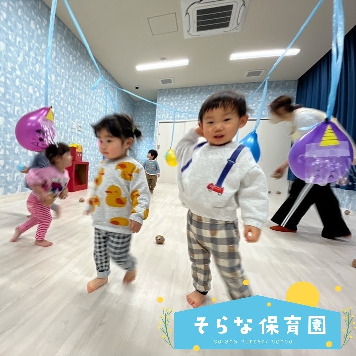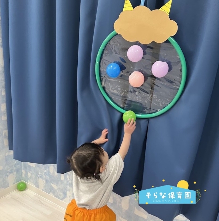 節分の日、天井からぶら下がった風船鬼、壁に貼られた鬼フープに向かって、ボールや新聞紙で丸めた“豆”を投げることを楽しみました❤️