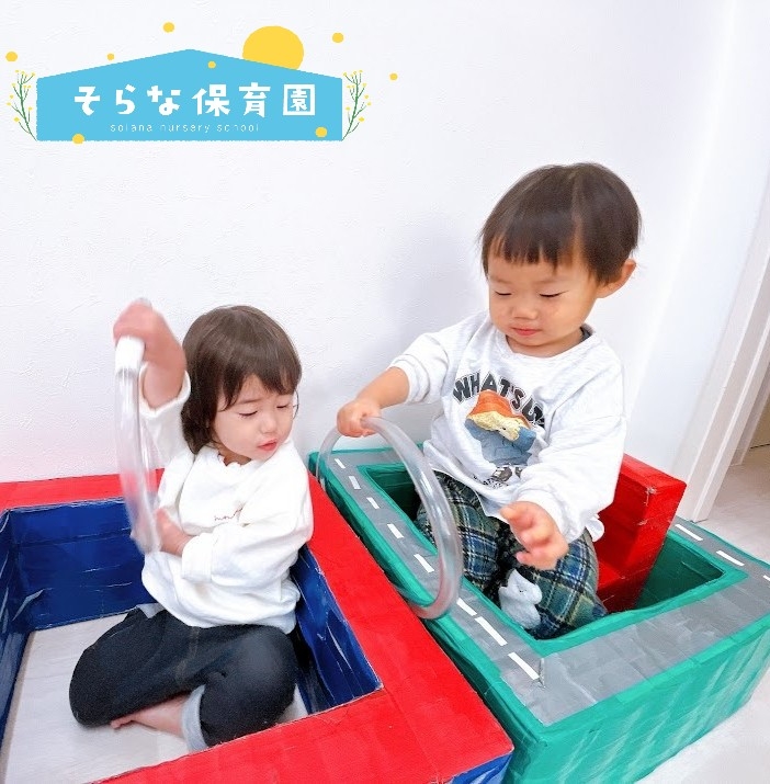 また形の異なる積み木を組み合わせ、車などが加わることでイメージを共有しながら遊びを広げています😊