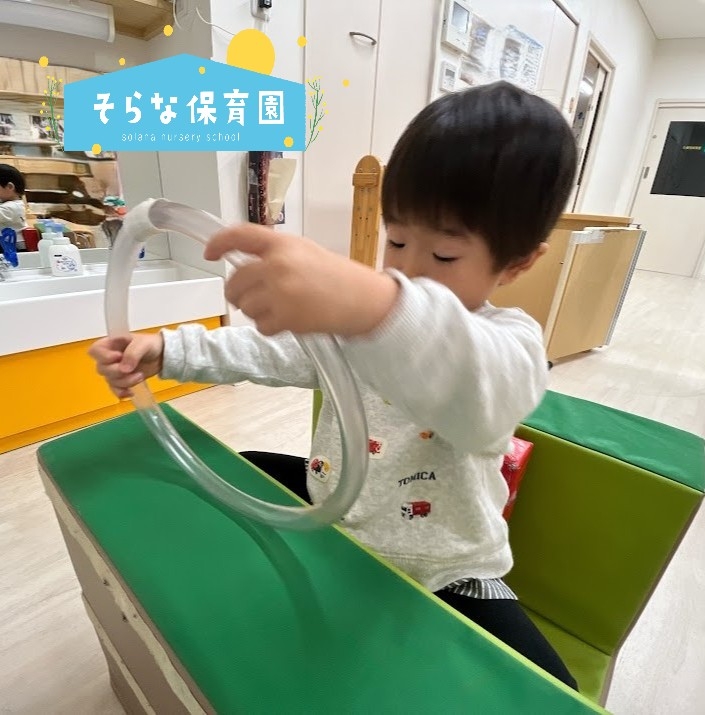 ある日、「火事です」と言って消防車になりきって遊びだす子、一緒になってごっこ遊びが始まり、急遽ビニールホースを渡すと壁に向かって人的消防車から消火活動が始まりました🔥